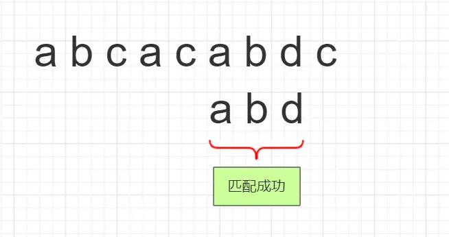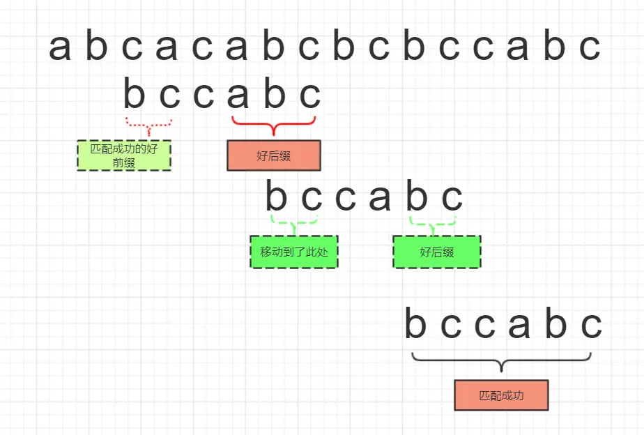 此时在模式串 bccabc 中找到了 bc ,然后将其移动到当前位置最终匹配成功,如果最后一个字符还不相等意味着匹配失败,没有找到。