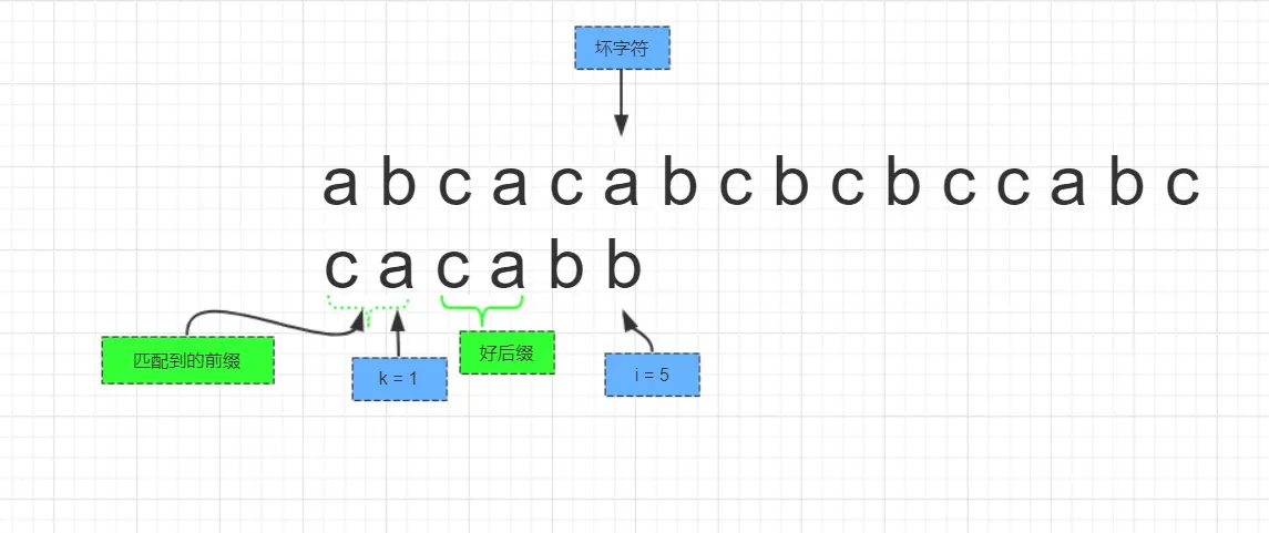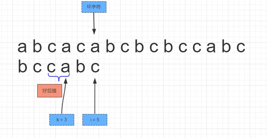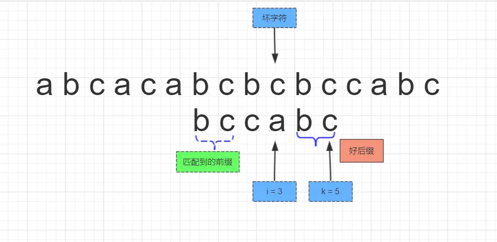 此时坏字符规则下移动 i - k = 5 - 3 = 2 位