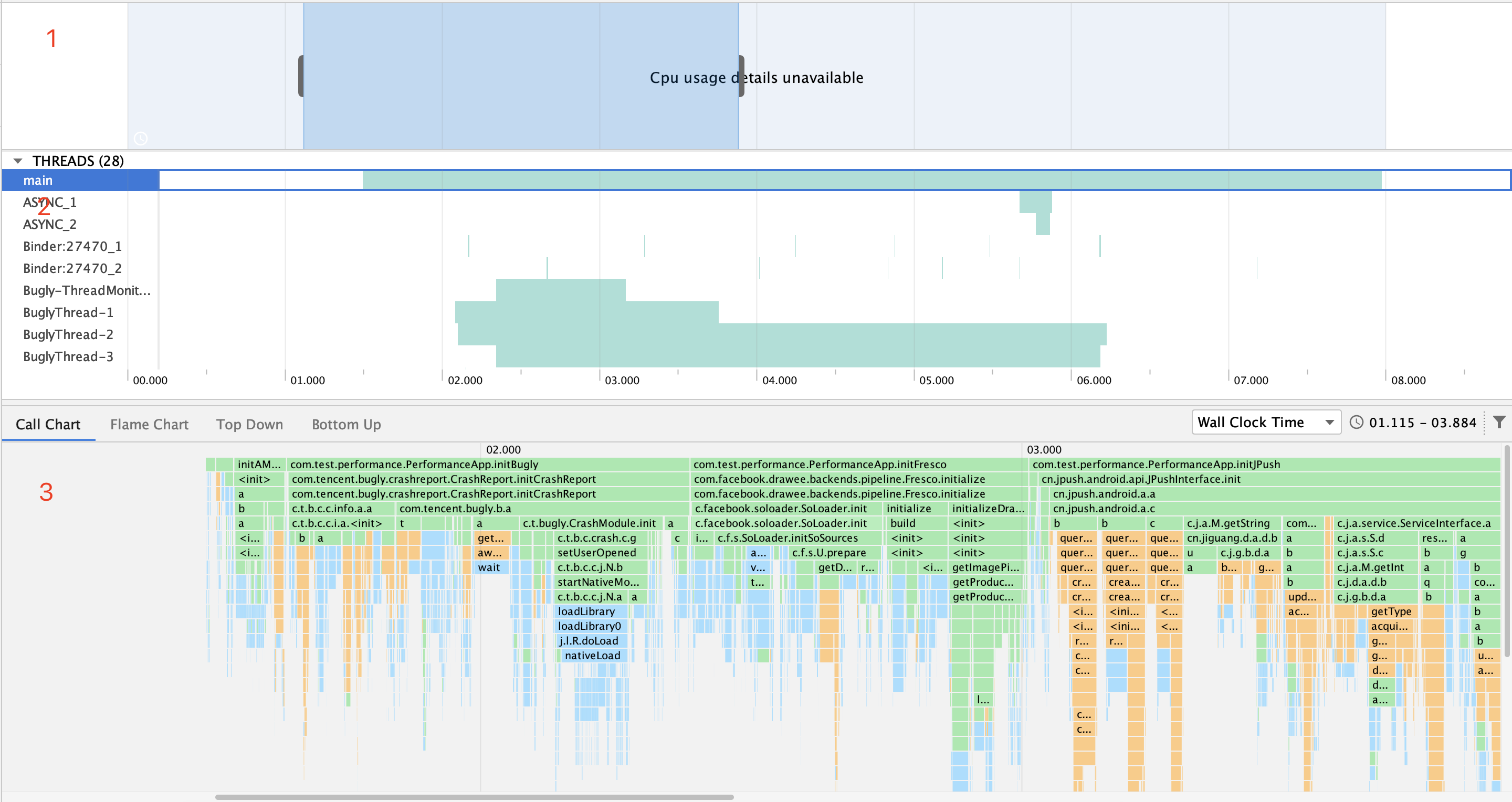 Call Chart:查看方法时间段和时间消耗,从上往下依次为调用顺序,系统api一般为橙色,应用自身方法为绿色,第三方api一般是蓝色;