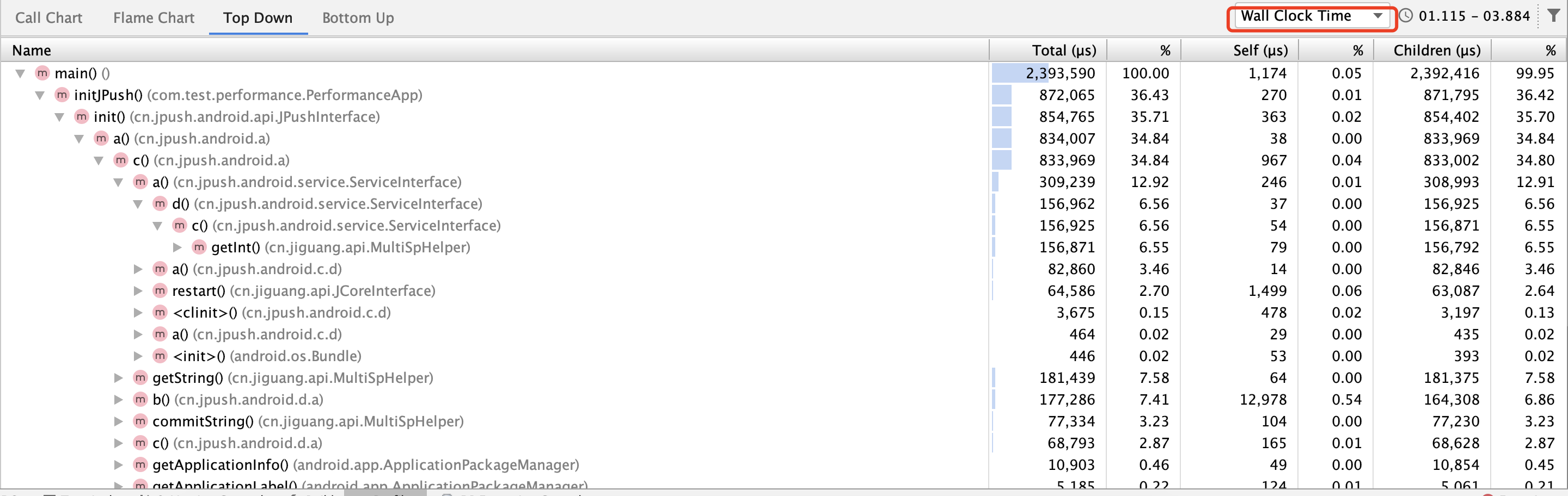 Total:方法执行总耗时;Self:方法内部除了调用的子方法总耗时;Children:调用的子方法总耗时;Total = Self + Children