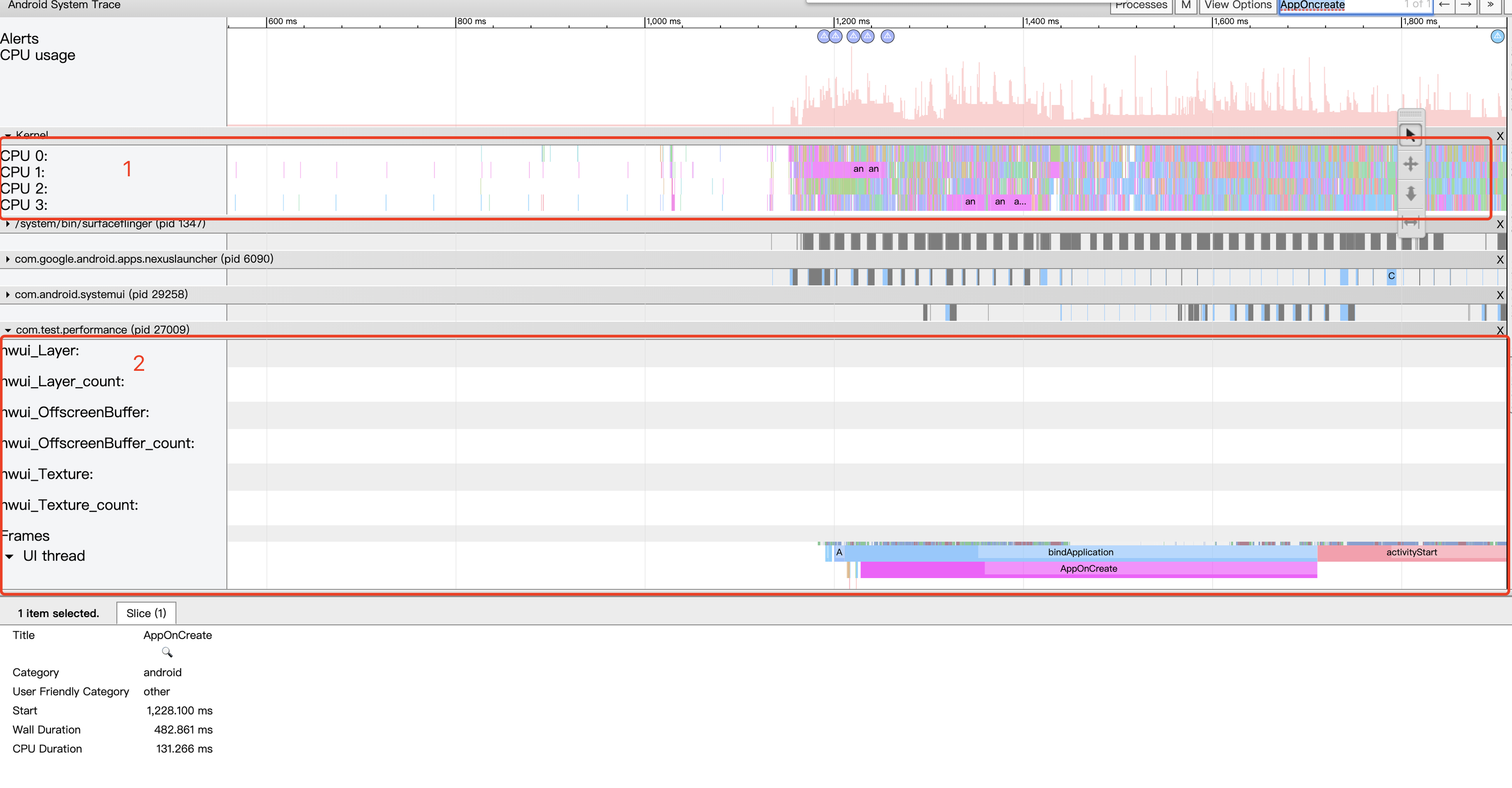 区域1用于选择时间范围,滑动可以选择查看时间范围内线程运行