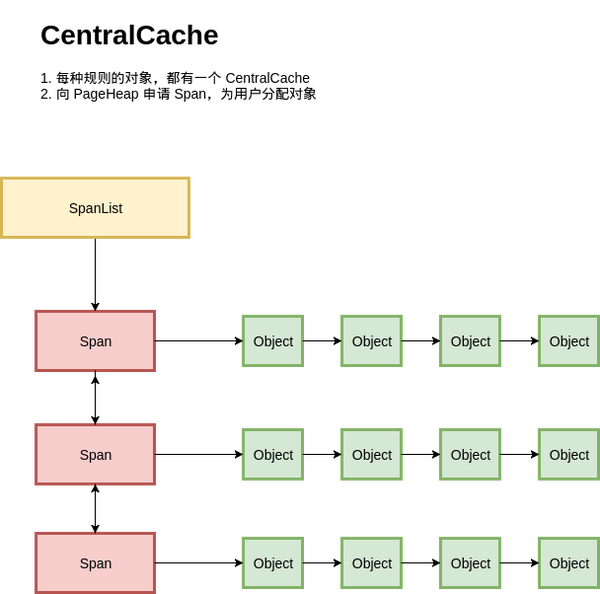 按照我们之前设计的,每种规格的对象,都从不同的 Span 进行分配;每种规则的对象都有一个独立的内存分配单元:CentralCache。在一个CentralCache 内存,我们用链表把所有 Span 组织起来,每次需要分配时就找一个 Span 从中分配一个 Object;当没有空闲的 Span 时,就从 PageHeap 申请 Span。