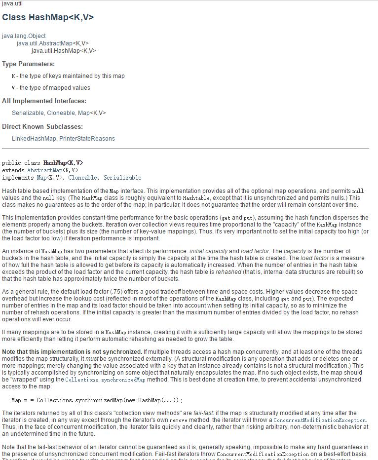 这个类不能保证Map的顺序; 特别是不能保证订单在一段时间内保持不变。 这个实现为基本操作(get和put)提供了恒定时间的性能,假设散列函数在这些存储桶之间正确分散元素。集合视图的迭代需要与HashMap实例的“容量” (桶数)及其大小(键值映射数)成正比 。 因此,如果迭代性能很重要,不要将初始容量设置得太高(或负载因子太低)是非常重要的。