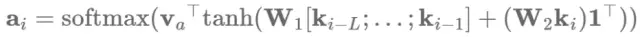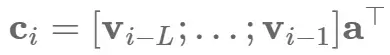 其中L是注意力窗口的长度,l是一个向量。然后通过这些来得到上下文表示向量ci: