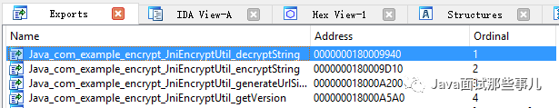 这里作者以Java程序员的角度来说一下什么是PE(ELF)文件的导出函数。导出函数就相当于Java包中的public 方法,可以被其他java应用程序通过引用的方式进行调用。而在PE(ELF)文件中,声明为导出函数的函数名称与地址将会在编译时被填写在PE(ELF)文件的导出表中,而其他进程在引用动态链接库时只能调用导出表中的函数(除非使用hack手段,才能调用任意函数,任意地址),通过IDA下查看动态链接库的导出表如下: