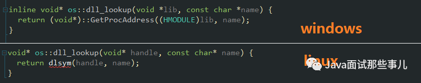 可以发现,这些导出表中的函数名与通过javah工具生成的头文件中的函数名完全一致。最后一个需要探讨的问题就是关于native方法的调用,其实也是由JVM实现的,从进程的角度看,方法调用实际上就是CPU执行地址寄存器(ESI)在指令内存空间的一次跳跃(JMP),Java在调用native 方法时,java进程通过导出表获取到对应函数在内存中的地址,然后跳过去执行 (注意导出表中的地址并不是函数的内存地址,是文件偏移地址,在被加载到内存后,还需要加上镜像基地址才能找到函数的内存地址)。当然寻找函数地址的方法,操作系统已经提供了现成的API,这里就不详解了,不同平台下具体实现如下图所示: