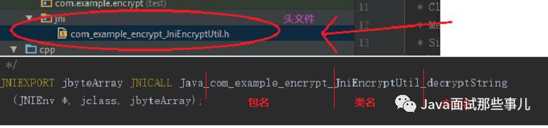 javah会根据java接口定义的包名,类名,方法名按照jni的命名规则生成函数定义头文件,同时该函数会被声明为动态链接库的导出函数: