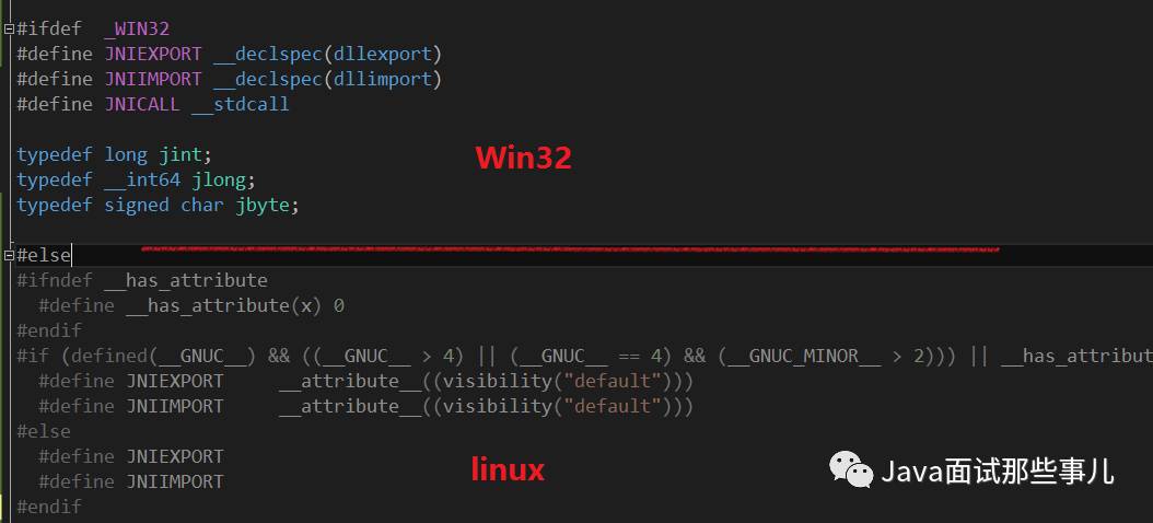 3.跨平台的开发问题。JNI动态链接库需要注意跨平台开发的问题,如果一套代码能支持多个平台,那将会是一件很愉快的事情。那我们如何做到呢?首先尽量避免使用依赖于平台特性的系统API,能使用C++标准运行时库的函数尽量使用运行时库来实现,如果必须使用特定平台的系统API,可以使用_WIN32宏来做代码区分编译。这里作者举一个例子,在jni_md.h中 JNIEXPORT与JNIIMPORT等函数导出宏在不同的平台下具有不同的声明,但该声明没有做到跨平台编译的支持,因此作者在项目中将jni_md.h进行了改造,将linux与Windows平台函数导出的声明放在了一起,并结合使用_WIN32宏来区别平台的版本 编译,如下:
