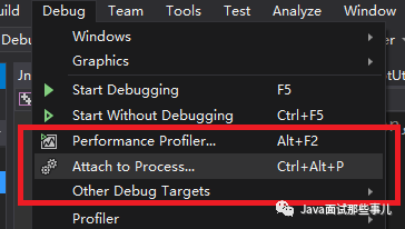 打开visual studio,并且打开DLL源码项目,通过Debug -> Attach Process的方式进行调试: