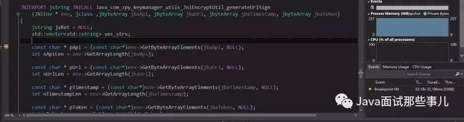 在被调用函数中使用F9下断点,此时便可以放开IDEA中的断点,java进程在加载了DLL后,并运行至C++中设置的断点后,就会被断下,此时就可以进行源码调试了,如下所示: