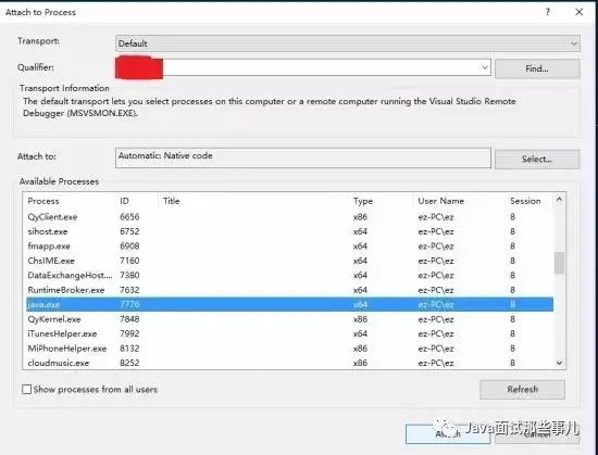 在进程列表中找到PID与Java调用进程PID相同的Java进程,点击Attache: