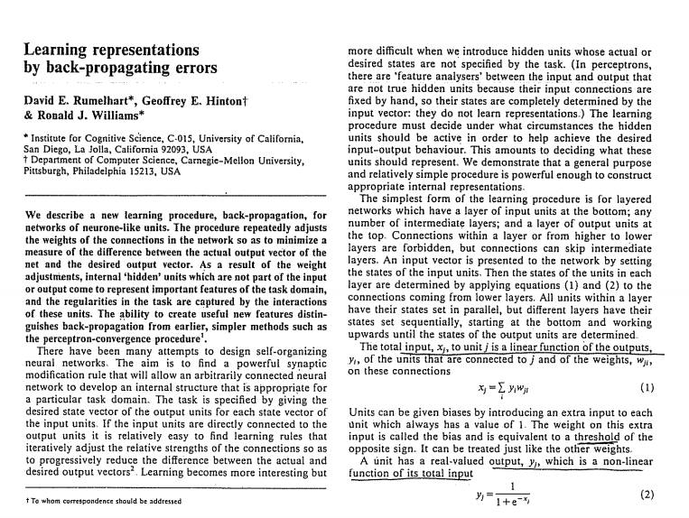 1986年,Geoffrey Hinton与David E. Rumelhart 和Ronald J. Wlilliams合著了一篇论文:Learning representations by back-propagation errors。首次将反向传播算法引入多层神经网络训练。为后来反向传播的大范围普及奠定了基础。