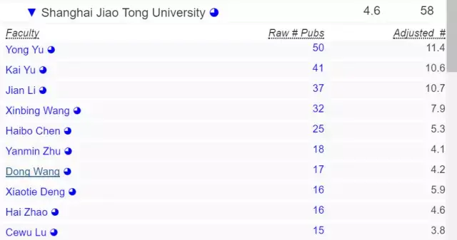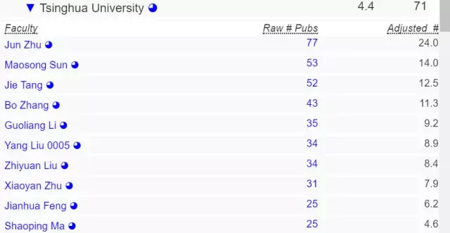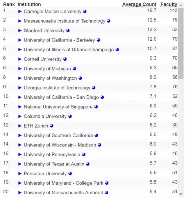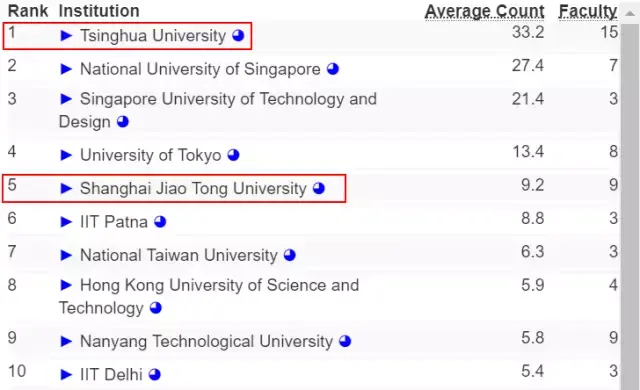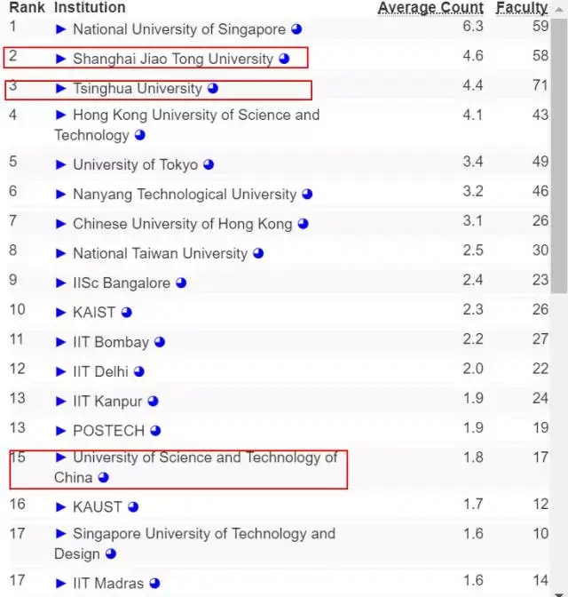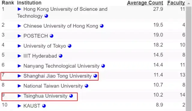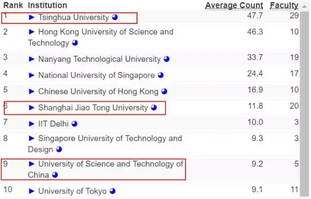 让我们把范围进一步缩小,如果只考虑亚洲高校在 AI 方面的实力,那么清华终于排到了第一,上海交通大学和中国科技大学则分列第 6 和第 9。