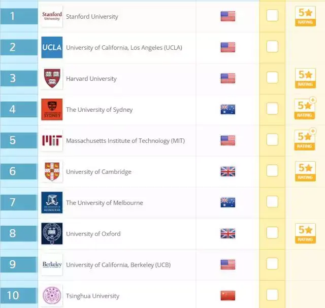 可以发现,和 QS 的毕业生就业竞争力排名一样,前 40 依旧被美国统治,中国只有上海交通大学和清华大学上榜,分别排名第 27 和 31。