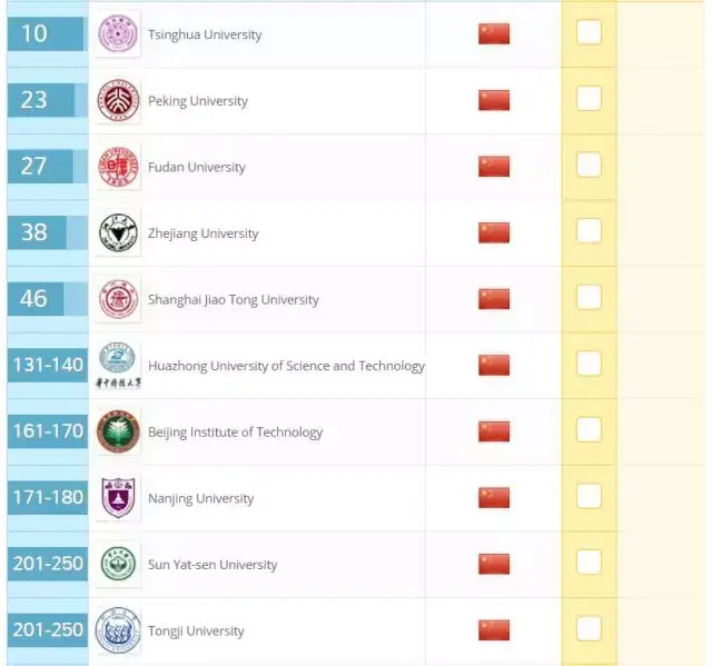 中国内地上榜高校中,除了清华大学之外,进入 100 强的还有:第 23 名的北京大学、第 27 名的复旦大学、第 38 名的浙江大学、第 46 名的上海交通大学。