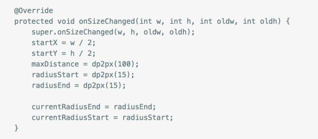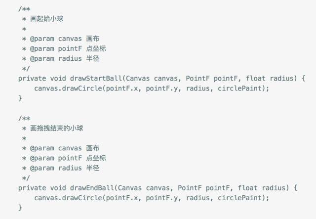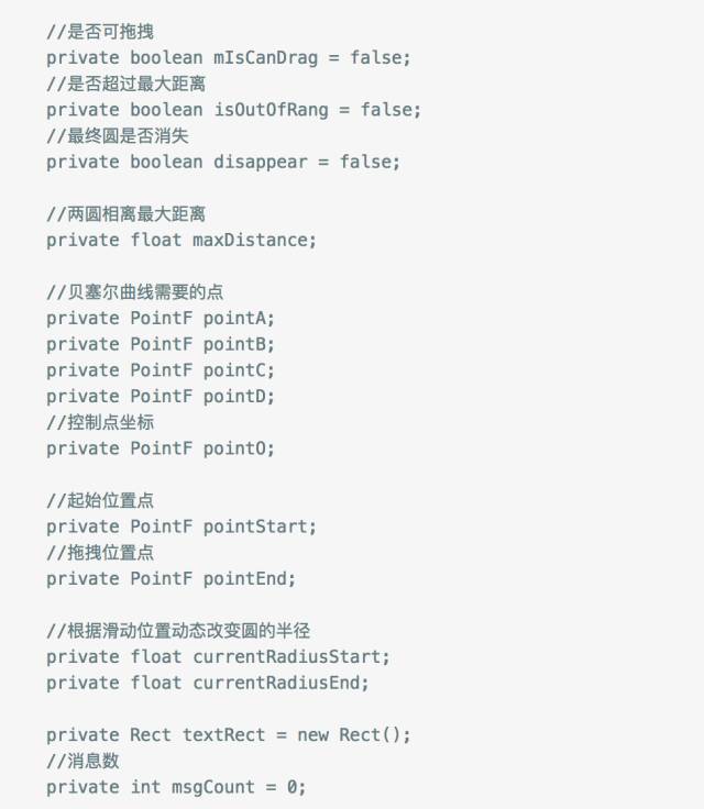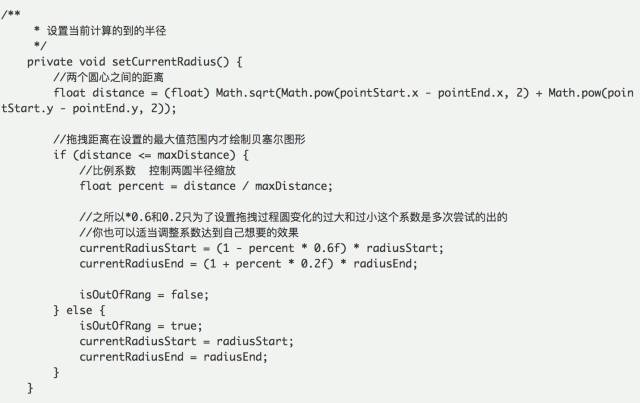 然后知道了起点圆的坐标和终点圆的坐标就可以得出所需要的各个点的坐标了,其中两圆圆心距也可以计算出来,然后根据圆心距与可拖拽最大距离的比例系数去设置两个圆的半径,当拖拽距离超过了最大距离我们通过改变状态去控制只绘制拖拽圆,否则绘制出两圆和中间的连接带,下面代码注释的很清楚了。