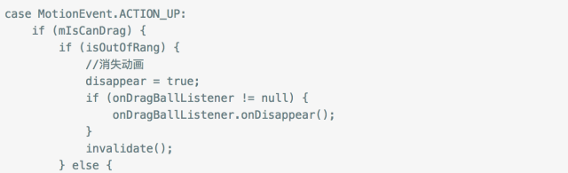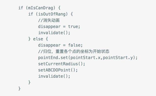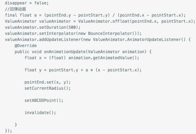 在拖拽范围内归位的时候我们设置动画让终点圆坐标从当前位置逐渐变化到起点位置,设置BounceInterpolator让动画出现跳动效果。并且在超过可拖拽范围并且释放消失的时候加上回调方法,我们可以在消失的时候出来自己的业务逻辑。