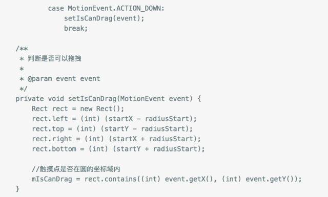 手指按下的时候我们要判断手指所在位置是不是在起点圆上,只有按到起点圆上之后拖拽才有效,还记得我们文章开始的时候定义的变量mIsCanDrag吧