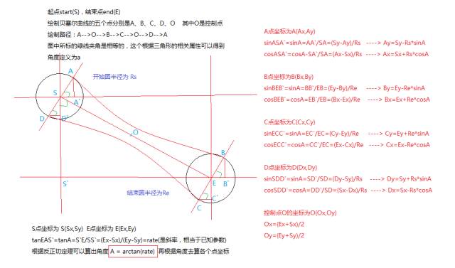 起点圆我们定义为圆S(start的缩写),对应的圆心坐标为S(Sx,Sy),可拖拽圆也就是终点圆定义为圆E(end的缩写),圆心坐标为E(Ex,Ey)。连接带的路径可以从图上看出来是:A-->O-->B-->C-->O-->D-->A,其中O为AOB和COD这两段二阶贝塞尔曲线的控制点,图中绿线标注了五个角度,这五个角度是相等的,可以根据三角形的相关定理得出,为了充分说明我们是史上最详细的解释,我就举个例子说明一下为什么角度相等,数学不错的伙伴可以跳过这段啦,角ASA1+ A1SE=90度=A1SE+ESD1可以推出角ASA1=ESD1,同理可以的出其余标示角度相等,我们定义为角A,后边我们就是根据角度计算各个点的坐标的。