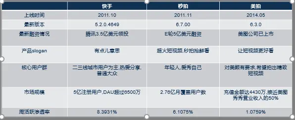 通过基本信息对比,可以发现,快手的产品定位为广大二三四线城市及乡村年轻用户群,这部分人群在中国占很大比例而且闲暇时间更多,娱乐方式较匮乏,而快手给了他们这个展示自我的机会,因此,快手在短视频行业现在一马当先,无论是用户规模还是用户活跃度上都领先于对手。而快手的slogan明显更加接地气,让人听了有种想玩的冲动,相比秒拍和美拍突出短视频的乐趣玩法,快手的slogan则可以直接让用户有参与感,人人都想要生活有点意思,更能激发新用户的尝试下载。