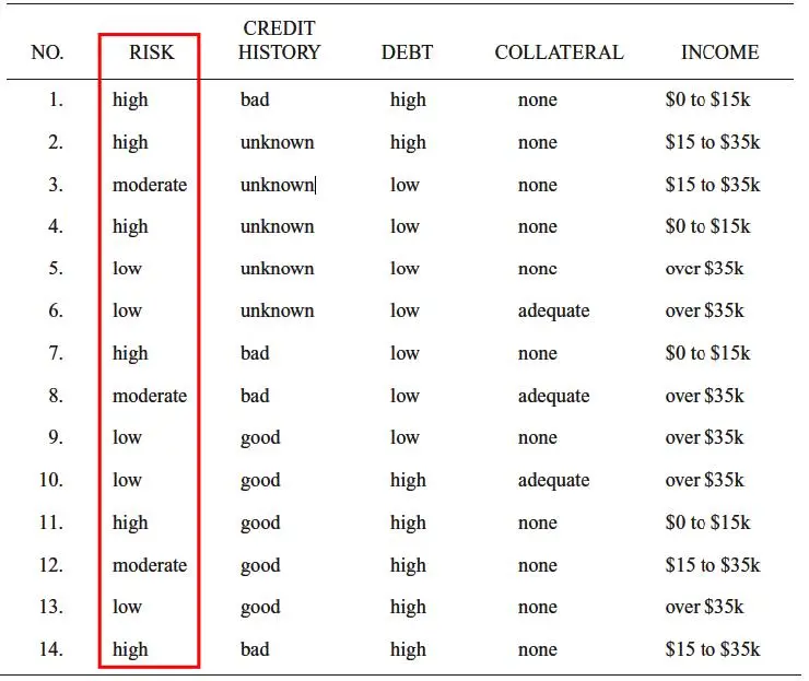 下面举个简单的例子助于理解。对于估计个人信用风险(risk)问题,要基于这样一些属性,比如信用历史(credit history)、当前债务(debt)、抵押(collateral)和收入(income)。下表列出了已知信用风险的个人的样本。
