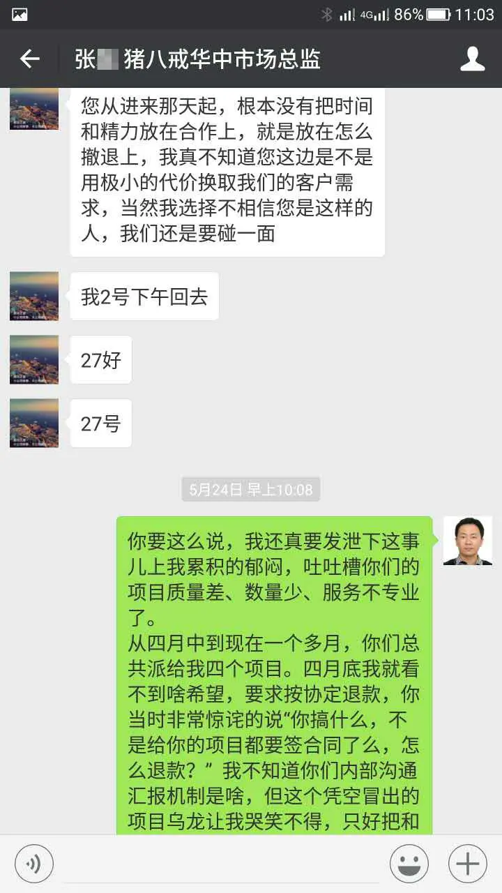 她表示手头有一个非常合适的项目可以帮我对接。双方商定,十天内成功对接我就放弃退款诉求,否则照走之前的退款流程。