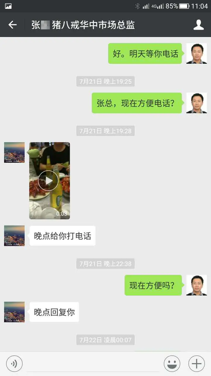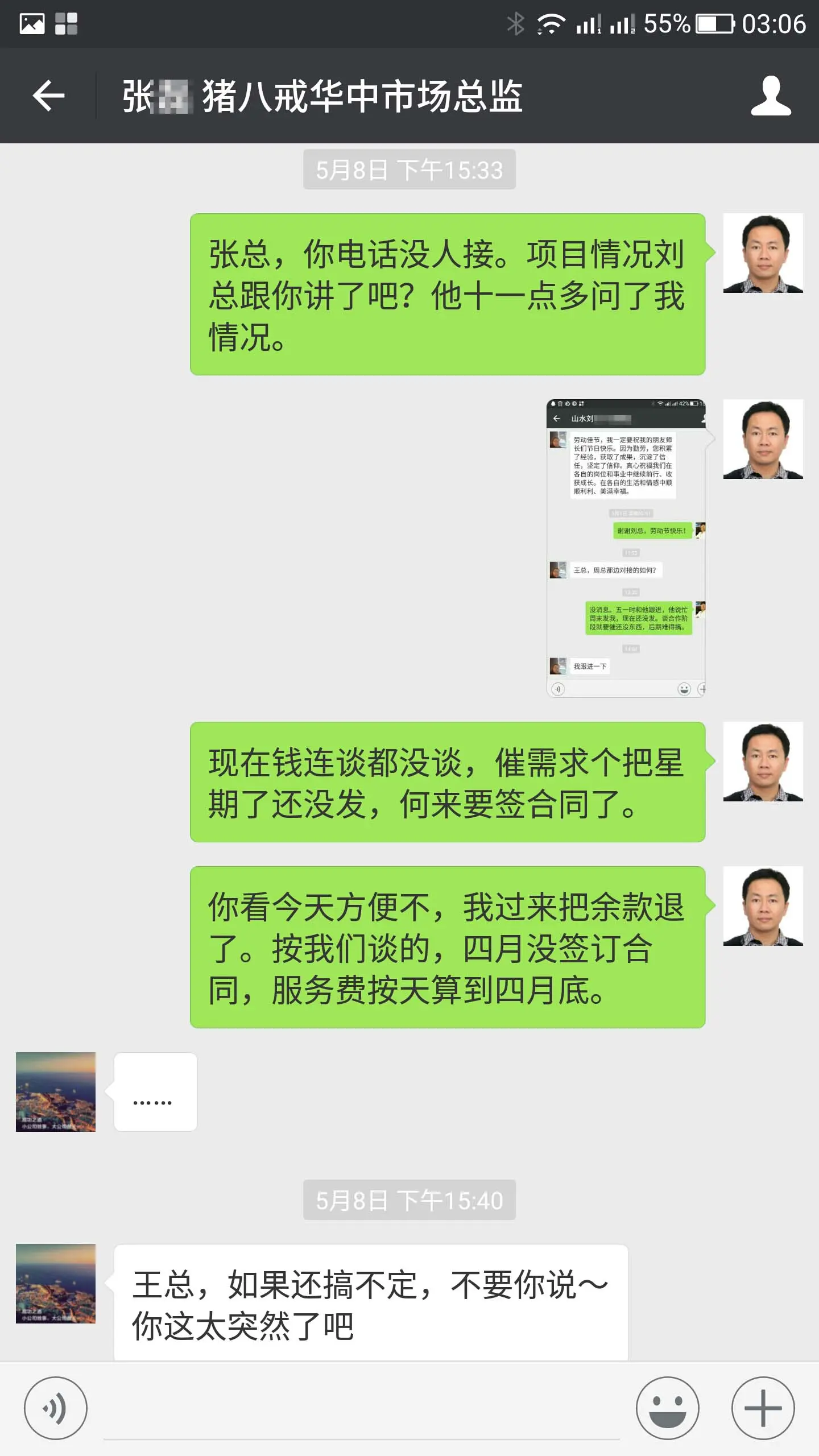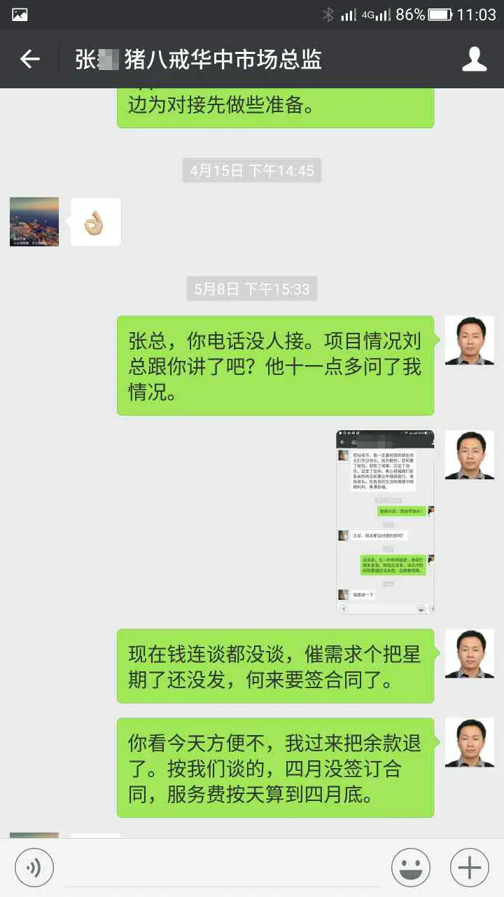 五一期间跟客户联系要具体需求,客户还是推脱忙,没下文。于是五月八号早上,我再次跟大张总联系退款。