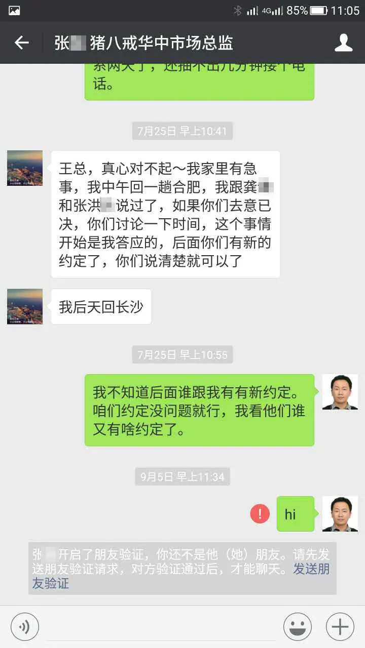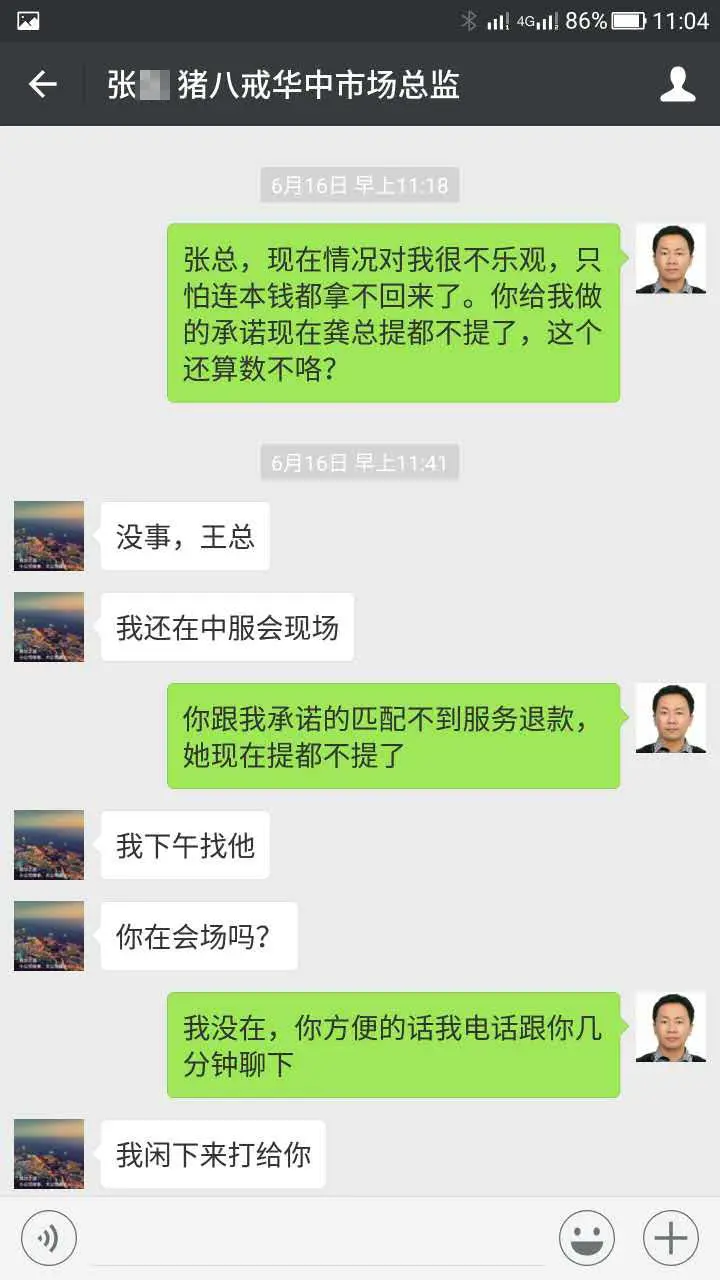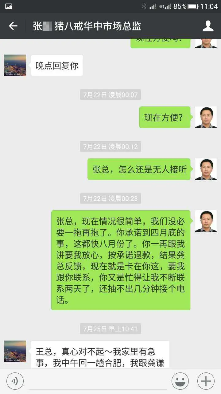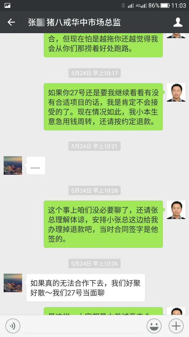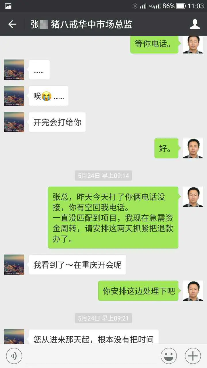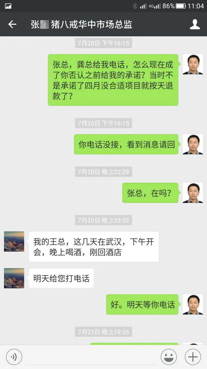 我开始多次的和大张总沟通,要求按约定退款。但是,一再遭到大张总各种拖延,数次约定面谈,却没有任何提前通知的失约。最后,他干脆直接失联,电话无法打通,并把我微信加入了黑名单。