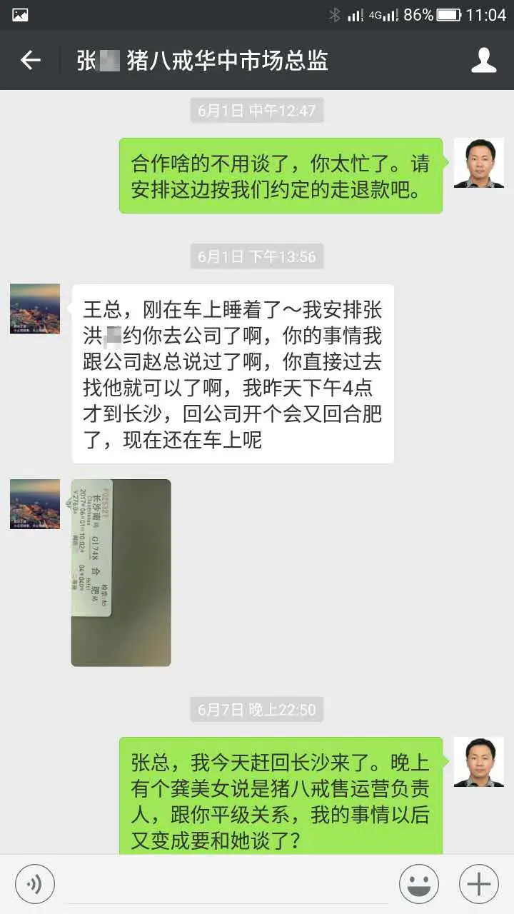一再的退让、失望,已经让我完全丧失了对猪八戒的信任。我只一个诉求,快点退款。龚总这边答应上报总部走流程。