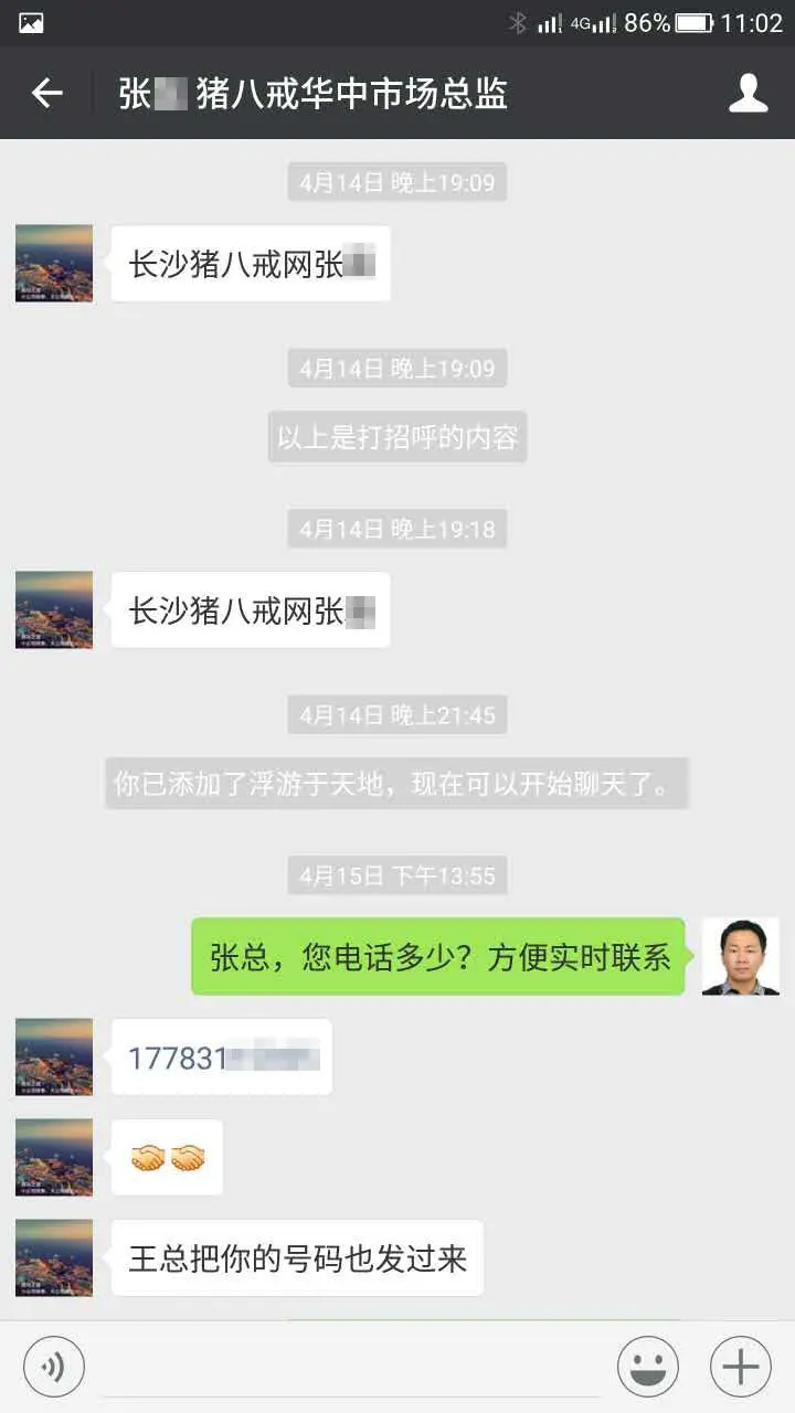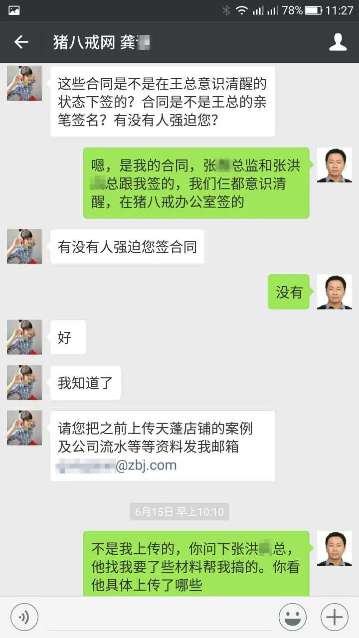 出于下意识的、对大张总的职业发展的保护考虑,我托辞手机重装,数据不知道能不能恢复,当时没给她。我表示,相信张总监不会撒谎,让她可以跟张总监确认他代表猪八戒做的承诺。