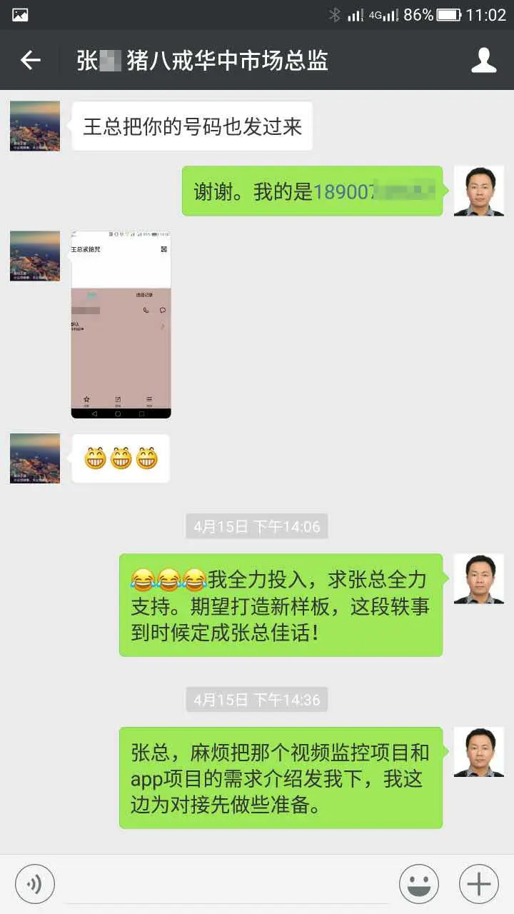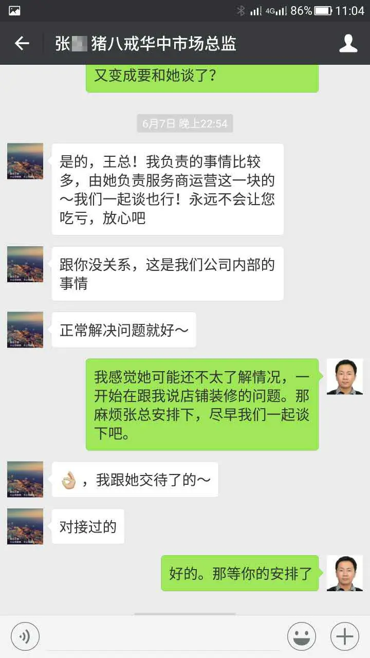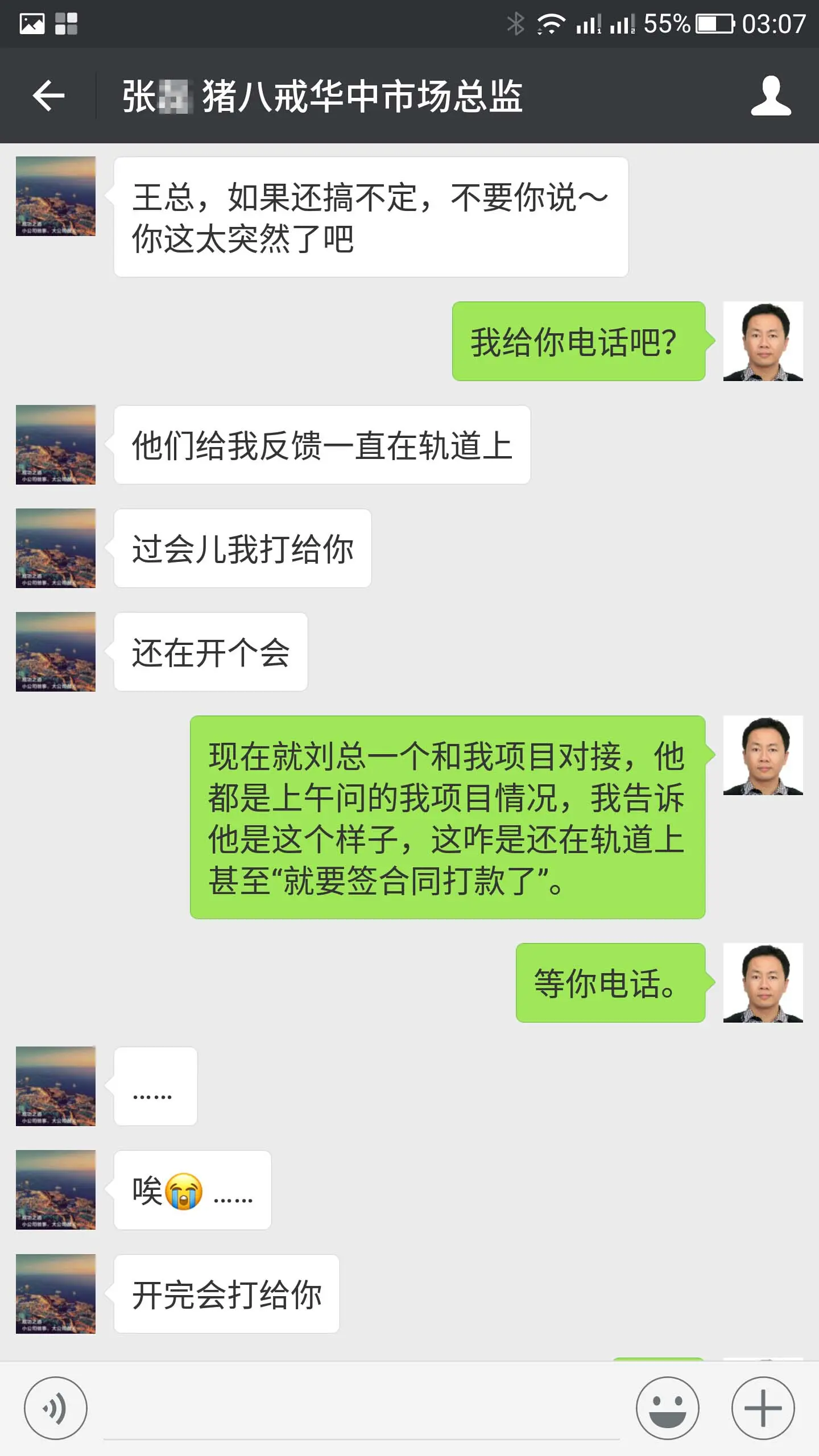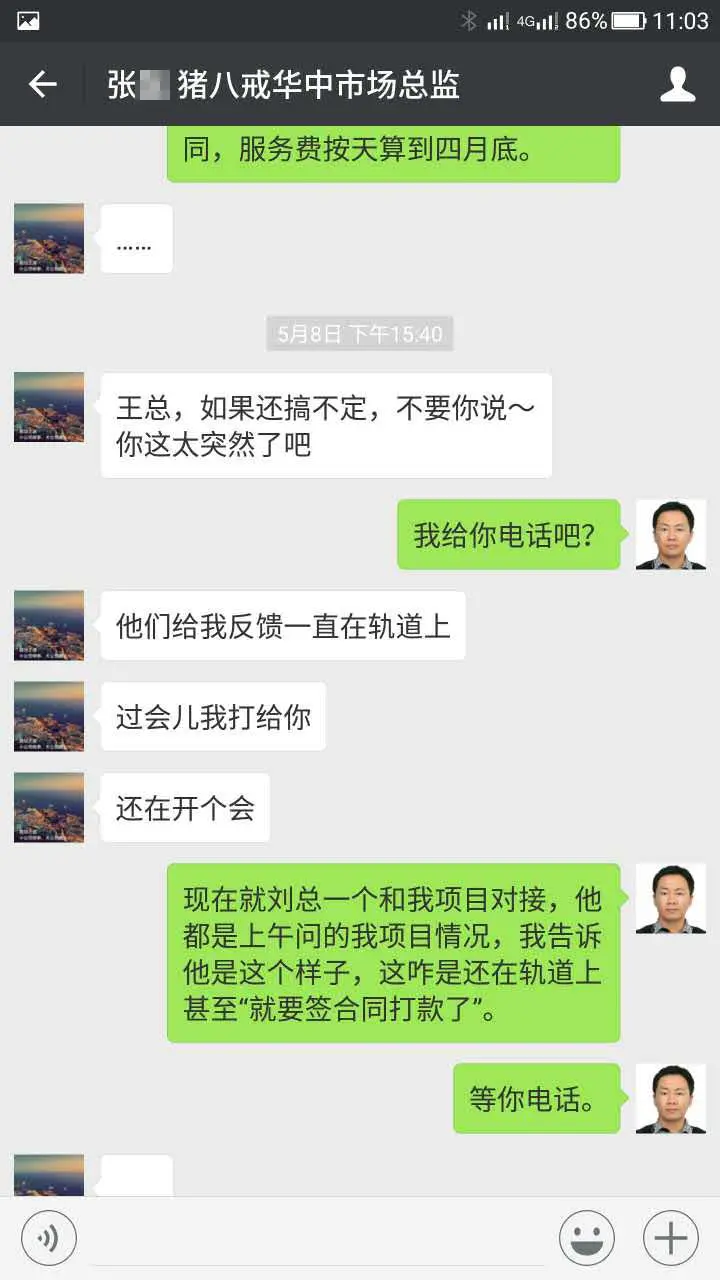 我听得莫名其妙,让他跟刘某再核实下。没一会儿刘某微信问我:“王总,周总那边对接的如何?”