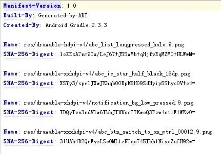 ▪ CERT.SF: 到跟manifest.mf中的很类似,也是BASE64编码的哈希值,是对MANIFEST.MF的每个条目再次计算摘要后的文件。如图所示: