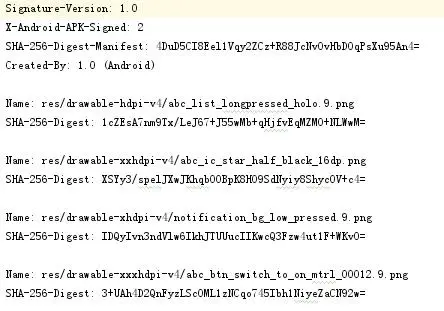 【APK中的签名验证】 1.签名信息将APK解包后,有一个叫做META-INF的文件夹,存储的是关于签名的一些信息。里面有3个文件:CERT.RSA,CERT.SF,MANIFEST.MF。 ▪ Manifest.MF:该文件可以通过文本编辑工具打开查看,可以看到包含了每一个文件(包括资源文件)的哈希值(BASE64)。如图所示: