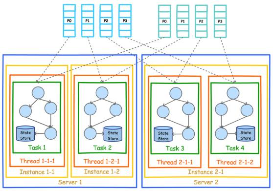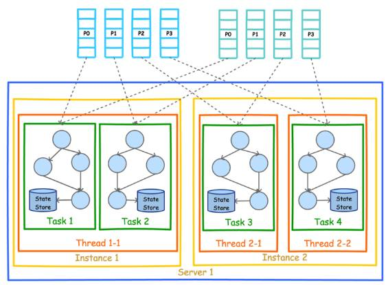 既然实现了多进程部署,可以以同样的方式实现多机器部署。该部署方式也要求所有进程的 APPLICATION_ID_CONFIG 完全一样。从图上也可以看到,每个实例中的线程数并不要求一样。但是无论如何部署,Task 总数总会保证一致。