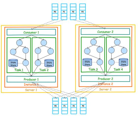 另外,上图中的 Consumer 和 Producer 并不需要开发者在应用中显示实例化,而是由 Kafka Stream 根据参数隐式实例化和管理,从而降低了使用门槛。开发者只需要专注于开发核心业务逻辑,也即上图中 Task 内的部分。
