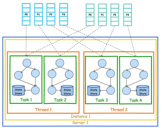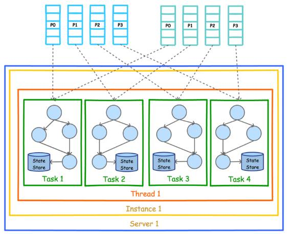 下图展示了在一个进程(Instance)中以 2 个 Topic(Partition 数均为 4)为数据源的 Kafka Stream 应用的并行模型。从图中可以看到,由于 Kafka Stream 应用的默认线程数为 1,所以 4 个 Task 全部在一个线程中运行。