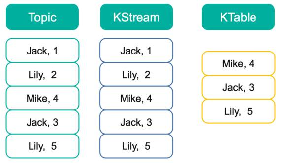 以下图为例,假设有一个 KStream 和 KTable,基于同一个 Topic 创建,并且该 Topic 中包含如下图所示 5 条数据。此时遍历 KStream 将得到与 Topic 内数据完全一样的所有 5 条数据,且顺序不变。而此时遍历 KTable 时,因为这 5 条记录中有 3 个不同的 Key,所以将得到 3 条记录,每个 Key 对应最新的值,并且这三条数据之间的顺序与原来在 Topic 中的顺序保持一致。这一点与 Kafka 的日志 compact 相同。
