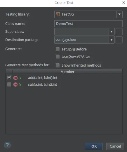 这里可以看到,我们选择了 TestNG 作为单元测试库,IDEA 自动为我们生成了单元测试类的类名,其命名规则为:被测试类+Test。最后勾选要进行测试的方法,这里我只选择 add 方法。