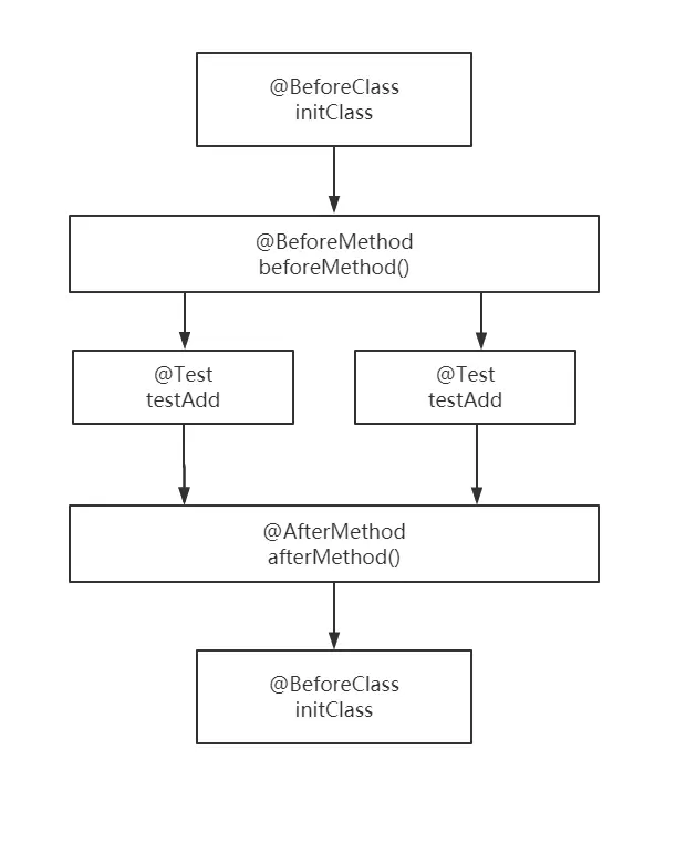 从上图可以看出,@BeforeMethod/@AfterMethod 是在 @Test 注解函数执行之前/之后执行的钩子函数。在执行每一个 @Test 注解函数执行之前/之后都会执行 @BeforeMethod/@AfterMethod 注解函数。