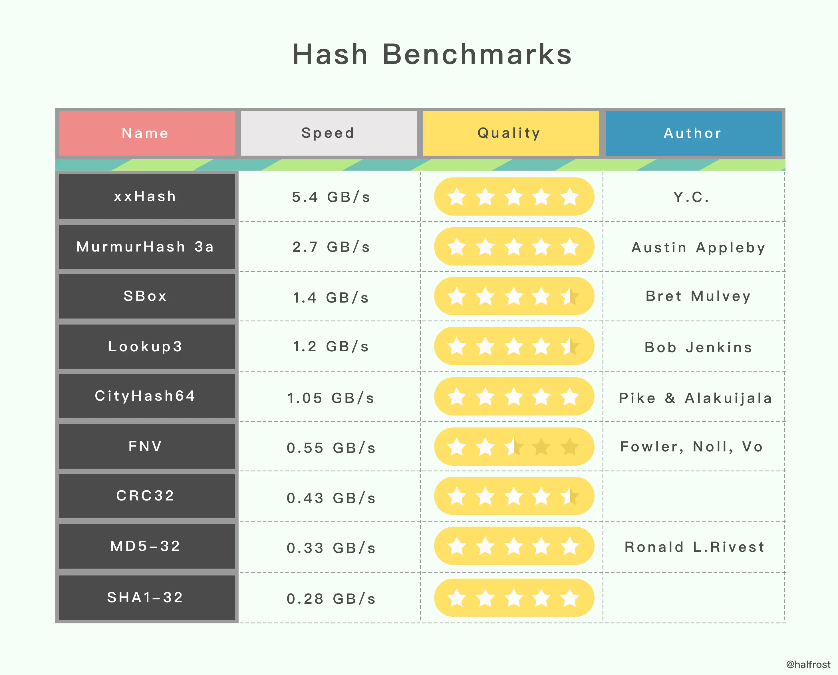 上表里面的 hash 函数并不是所有的 hash 函数,只列举了一些常见的算法。第二栏是速度的对比,可以看出来速度最快的是 xxHash 。第三栏是哈希的质量,哈希质量最高的有5个,全是5星,xxHash、MurmurHash 3a、CityHash64、MD5-32、SHA1-32 。从表里的数据看,哈希质量最高,速度最快的还是 xxHash。