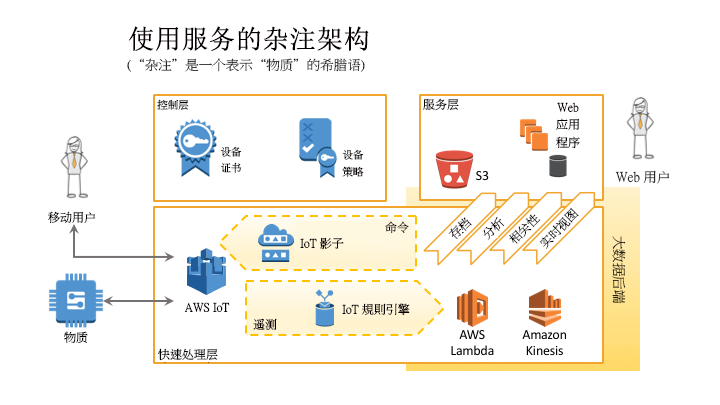 杂注架构是单一的衔接透视图,阐明了在使用 AWS 服务时 IoT 的核心原则如何表示为 IoT 解决方案。