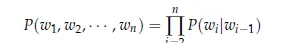 我们知道这种做法看起来很可笑,因为下一个单词的出现会高度依赖于之前的单词序列。并且这种简单句子例子实际上出现的概率会很高。所以,我们尝试使句子出现的概率取决于每个单词和相邻单词组成的单词对的概率。我们将这种方法称为二元语言模型(Bigrams)并表示为: