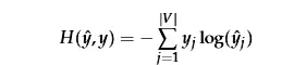 现在当我们拥有一个V和U时我们将会理解CBOW如何工作,将如何学习这两个矩阵?那么我们需要创建一个目标函数。 很多时候,当我们尝试从一些真实概率学习概率时,我们期望使用信息理论给出我们两个分布之间距离的度量。 在这里,我选择使用流行的距离/损耗方法来计算交叉熵H(y-hat,y)。 在离散情况下,可以通过损失函数来计算交叉熵得出:
