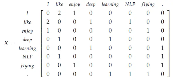 下面解释下结果: 首先要记住窗口(window)大小1。对于矩阵中(I,I)的值为什么为0呢?对于单词I,我们扫描第一个句子,因为I enjoy flying中单词I出现了,I前面为空,后面紧跟单词enjoy,所以(I,I)的值为0;然后扫描第二个句子同样前后没有出现I,这是(I,I)为0;同样扫描第三个句子之后,(I,I)值仍为0。对于(I,like)的值为什么为2呢?扫描第一个句子后,I的前后一个单位没有出现like。对于第2个和第3个句子,I的后面出现了like,所以最后(I,like)的值为2,其他同理。