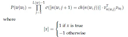 在方法中,在给出单词w的词向量wi后,则单词w的概率为P(w|wi.),等于从根节点随机游走到相应的叶节点W的概率。这种计算概率的方法主要优势就是时间复杂度降低到O(log(|V|)).