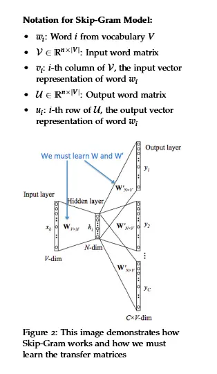 我们创建两个矩阵,V∈IRn×|V|和U|V|×n.其中n可以使任意大小的,它定义了嵌入空间的大小。V是输入矩阵,当单词wi作为模型的输入时,V的第i列是wi的输入向量,记为vi。同样地,U是输出矩阵,当单词wj作为模型的输出时,U的第j行为单词wi的输出向量,记为uj。注意,我们实际上为每个单词wi学习两个向量(即输入词向量vi和输出词向量ui)。