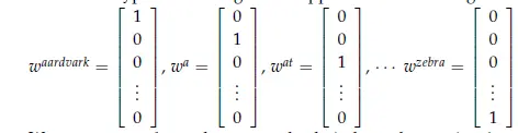 所以让我们看看第一个词向量并且也可以说是最简单的,one-hot向量。将每个单词表示成IR|V|x1向量,这个词向量就是有很多0和一个1组成(1的位置就是该单词在排序英文出现的索引位置)。在上面的标记中,|V|是词汇的大小。以这种形式编码的词向量看起来如下: