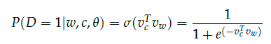 Mikolov在“Distributed Representations of Words and Phrases and their Compositionality”中提出了负采样。尽管负采样是基于Skip-Gram模型,但是事实上,它可以用来优化不同的目标。考虑一组单词(word)和上下(context)(w,c),这组数据是来自我们的训练数据吗?我们将(w,c)来自训练数据的概率记为P(D=1|w,c),相应地,(w,c)不是来自训练数据的概率记为P(D=0|w,c)。首选,使用sigmoid函数建立P(D=1|w,c)的模型: