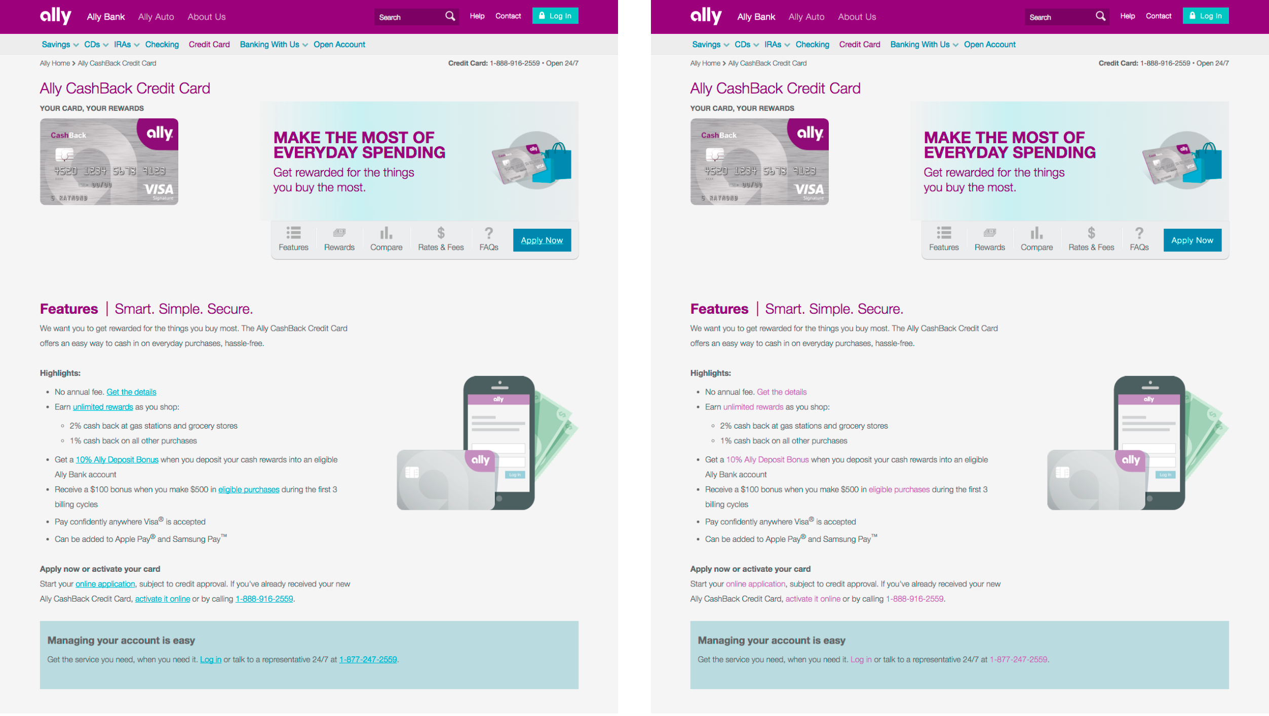 Ally Bank 的刺激对:强指示符版本(左)使用下划线、蓝色文本链接,而弱指示符版本(右)使用紫色文本链接。