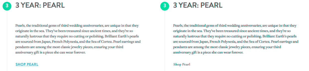 Brilliant Earth:点击强指示符(左)和弱指示符(右)版本目标链接(图中的 Shop Pearl)的局部放大图